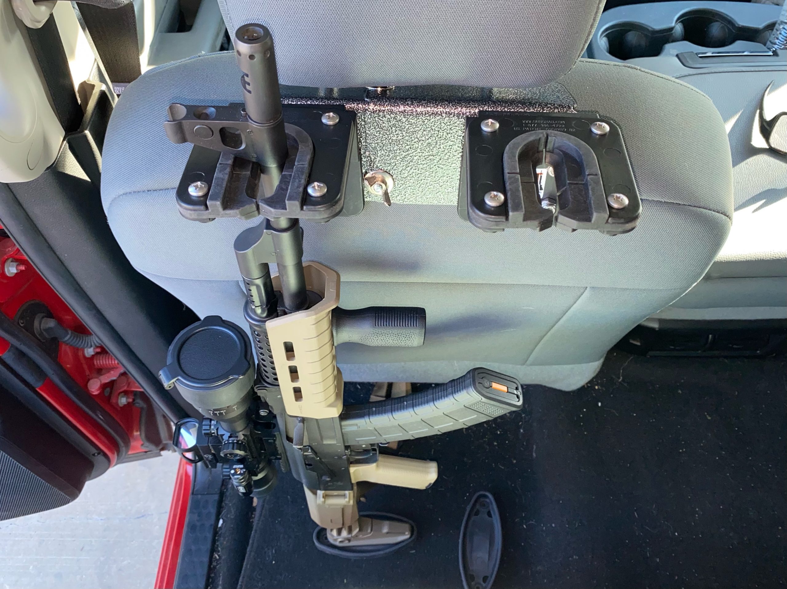 Our NEW double gun rack can be installed in any vehicle with a head rest. Ideal for carrying your guns while hunting, sporting clays, heading to the range, or out on your farm. Holds two guns upright with two shock absorber rubber gun butts to hold them in place.